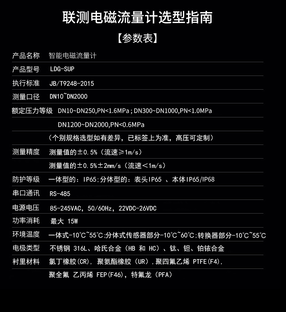 聯測LDG電磁流量計適用于化工助劑、海綿城市、給水排水、水利灌溉、水處理、污水處理(環保污水控制、化工污水、電鍍污水)、造紙漿液(紙漿)、泥漿、醫藥原料、食品等工農業的生產公司過程流量測量和控制,標配485通訊功能。