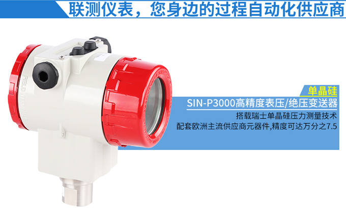 產品簡介:SIN-P3000單晶硅壓力變送器 0.075%高精度 穩定性簡介:SIN-P3000單晶硅壓力變送器用于測量液體、氣體或蒸汽的液位、密度、壓力,然后將其轉變成4-20mAHART電流信號輸出,也可與HART375或BST Modem相互通信,通過他們進行參數設定、過程控制。與傳統壓力變送器的區別在于它使用的是納米單晶硅作為傳感器材料。